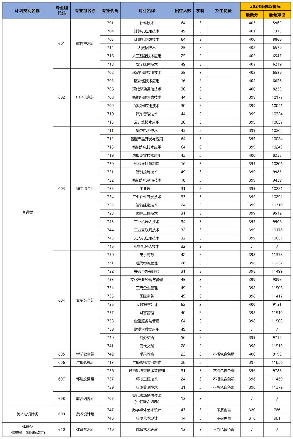 深圳信息职业技术学院2025年广东省春季高考招生(依学考成绩招生、“3+证书”招生)计划2800人,其中依学考成绩招生1800人,“3+证书”招生1000人。依学考成绩招生专业组分为普通类8组、美术类1组、体育类1组;“3+证书”招生专业组分为中职生类9组、退役士兵类1组。