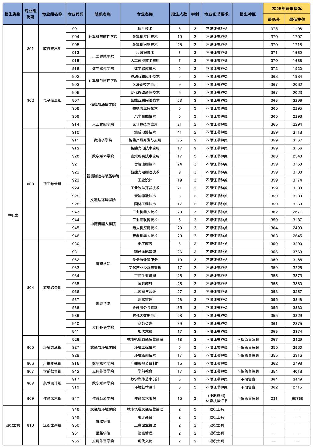 “依学考录取”共设9个专业组,分为普通类7组、美术类1组、体育类1组;“3+证书”考试录取共设10个专业组,分为中职生类9组、退役士兵类1组。